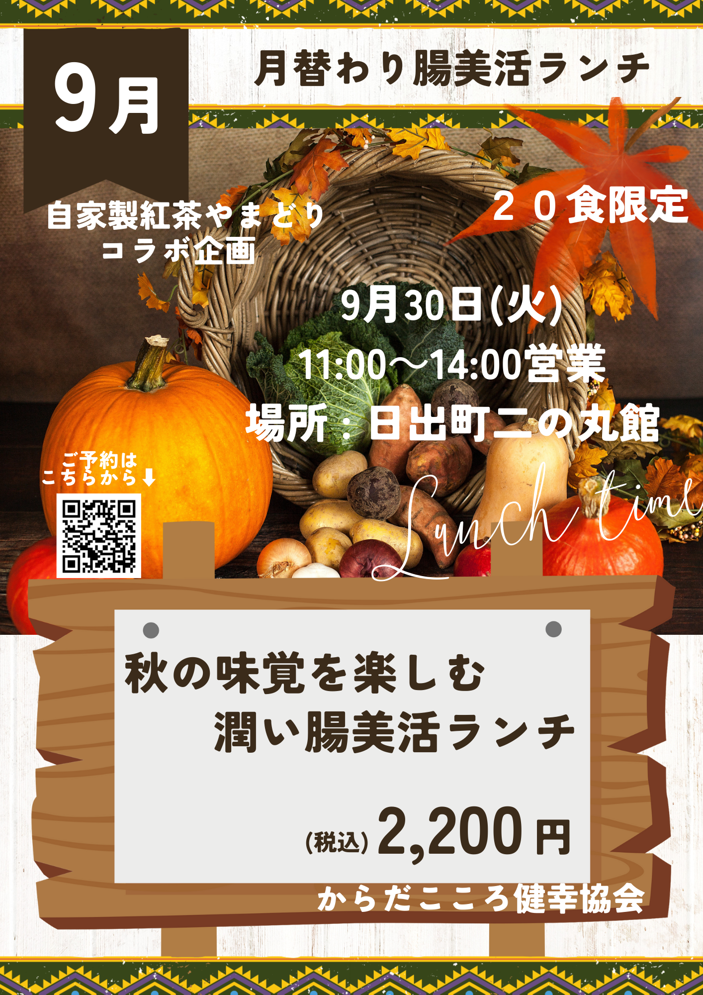 9月開催の腸美活ランチ会は、秋の潤い腸美活ランチとなります。【限定20名さま】予約制となっておりますので、ぜひ、お友だちやご家族お誘いの上お越しくださいませ。